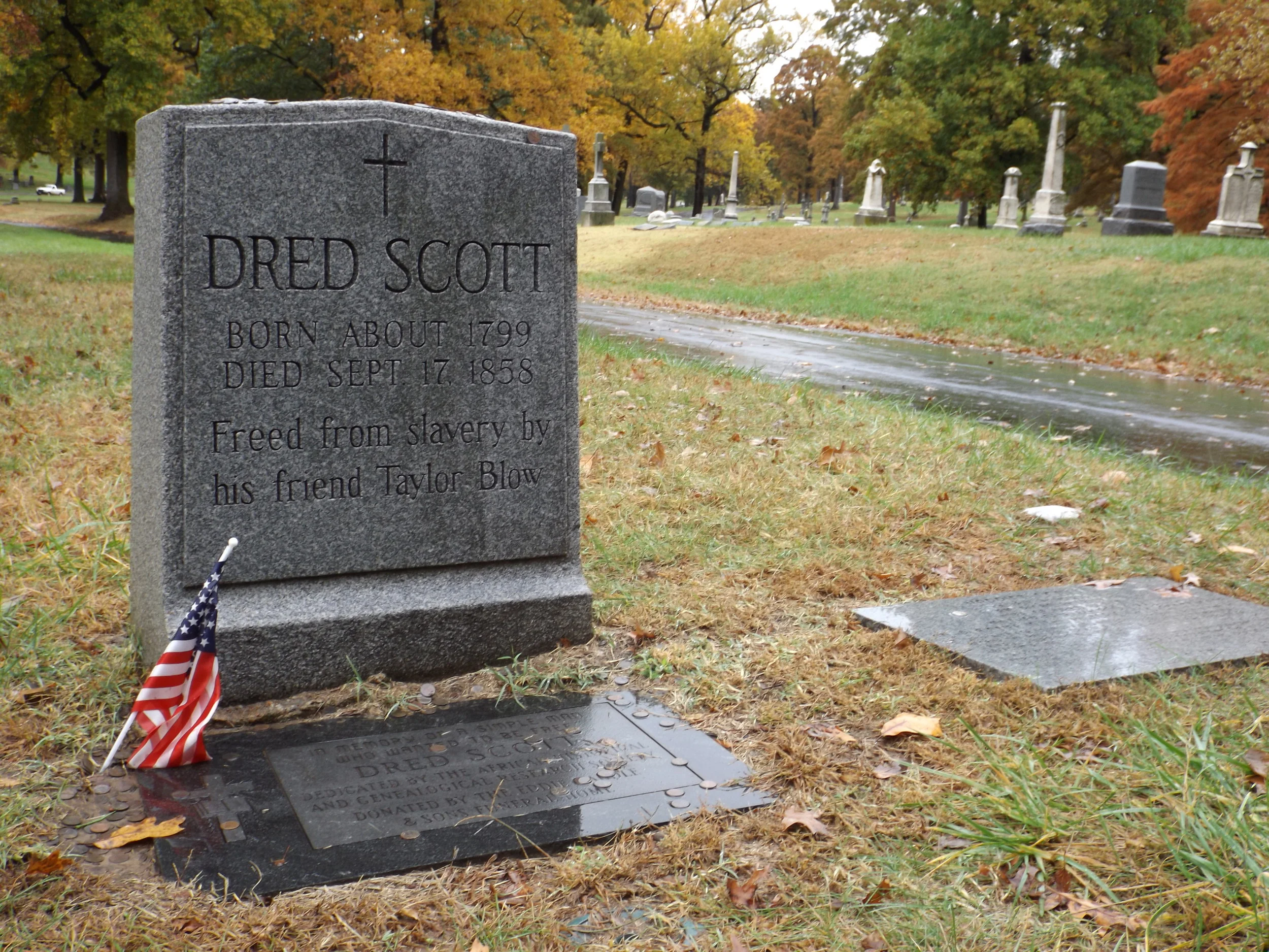 While the nation buzzed with reactions to the Court’s ruling, the decision was a personal tragedy for the Scott family. Having pursued their freedom for a decade, they had finally exhausted their legal options and remained enslaved. Fortunately, the sons of their first owner, Peter Blow, had helped them with their legal cases and now purchased emancipation for Scott and his family in late May 1857. Scott worked in a St. Louis hotel until his death of tuberculosis in November 1858 and Harriet died in 1876. Both are buried together in St. Louis’ Calvary Cemetery. Today a monument to Dred and Harriet stands outside the courthouse where they first filed their suit for freedom. Together they gaze at the Arch, a symbol of the western expansion so crucial in their lives and claims for freedom.