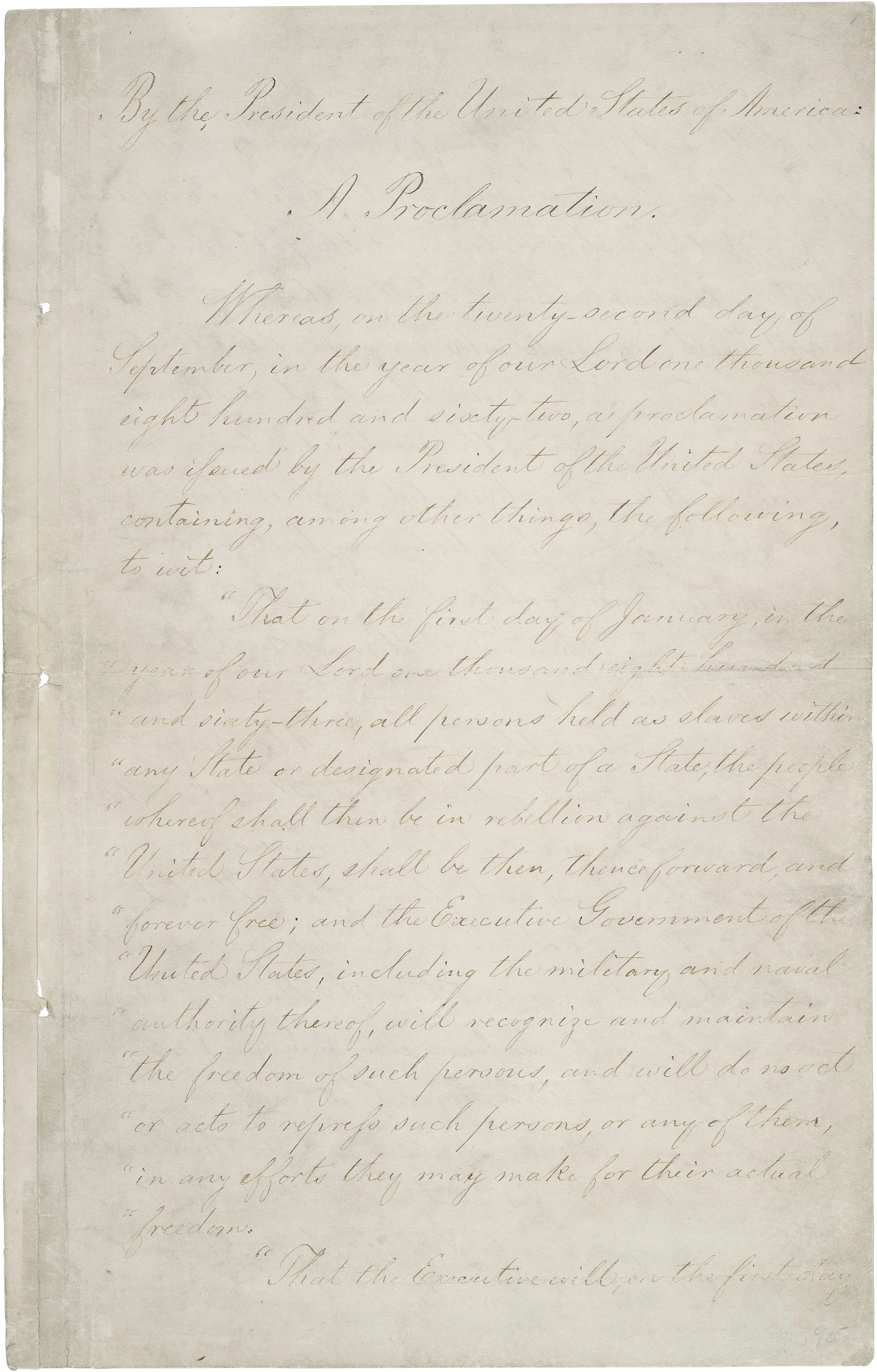 “That on the first day of January, in the year of our Lord one thousand eight hundred and sixty-three, all persons held as slaves within any State or designated part of a State, the people whereof shall then be in rebellion against the United States, shall be then, thenceforward, and forever free…”